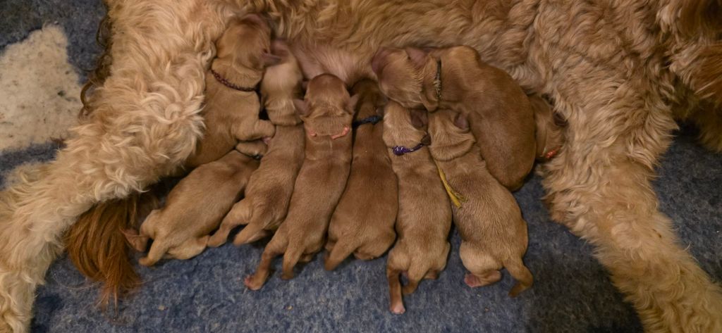 Onze pups worden bij ons in huis geboren. Ze zullen hier ook te midden van de andere honden opgroeien, tot ze klaar zijn om te verhuizen naar hun gouden mandjes. Ze zullen mogen uitvliegen tussen de 7 en 8 weken oud.
